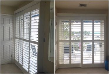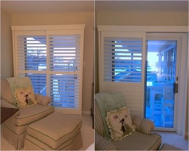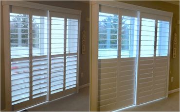 Available in wood and other materials, plantation shutters can come with or without a front tilt bar, and are also a great choice for French and sliding glass doors.